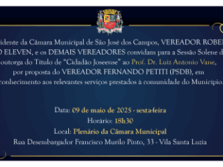 Acontece nesta sexta, dia 9 de maio, às 18h30, no Plenário da Câmara Municipal, a cerimônia de entrega do Título de Cidadão Joseense para o Prof. Dr. Luiz Antonio Vane, diretor-geral da Humanitas, Faculdade de Ciências Médicas de São José dos Campos.