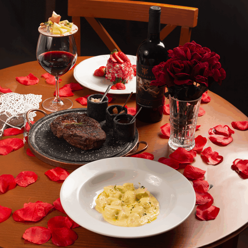 Romeu & Julieta (R$ 270 por pessoa): as boas-vindas serão com uma taça de vinho e petit four com queijo. A entrada vem com nhoque com fonduta de parmesão e azeite trufado. Para o prato principal, um Bife Ancho Reserva Angus Uruguaio com uma opção de acompanhamento (purê cremoso e defumado de batata doce com cenoura, legumes na brasa ou fritas rústicas). A experiência finaliza com um delicioso cake de morango.