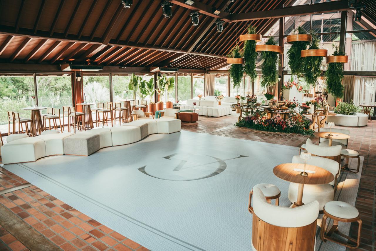 Após a cerimônia, os convidados são recepcionados em um salão de festas com estrutura profissional para até 300 pessoas, incluindo pista de dança, palco, cozinha industrial e deck externo integrado à paisagem. O complexo dispõe ainda de sala exclusiva da noiva e áreas de apoio para equipes técnicas e fornecedores. A hospedagem no próprio local é um dos grandes diferenciais. Suítes premium, cabanas privativas e áreas de descanso garantem conforto e privacidade para noivos, familiares e convidados, permitindo que a celebração se estenda por mais de um dia.